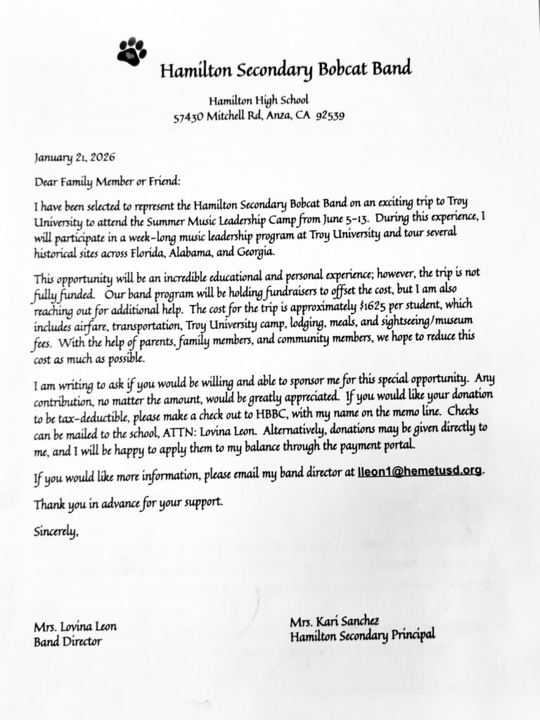 If you would like more information, please email my band director at lleon1@hemetusd.org.